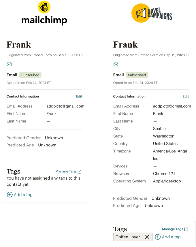 Boost your data collection efficiency with Novel Campaign’s Smart Forms! Every time your customers signs up for a newsletter, gather additional customer details like their city, state, country, timezone, and beyond.